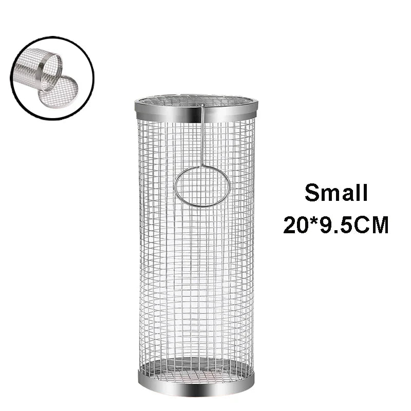 Cesta de churrasco de aço inoxidável rolando grelhar cesta de malha de arame cilindro grill cesta portátil redondo acampamento ao ar livre rack de churrasco